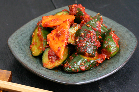 Cucumber cut and marinated in kimchi seasonings.