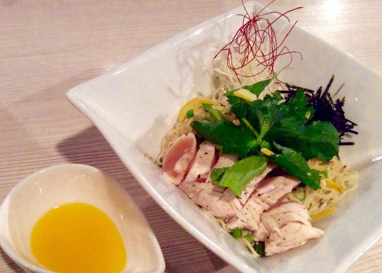 Fresh or lightly boiled, chicken from the boned portion of the front ribcage cut within 1cm, called sasami, covered in sauce and seasoning, served with an egg yolk on top.