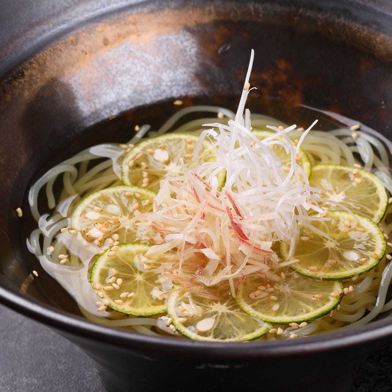 Noodles made from buckwheat and others flour in cold broth topped with meat and vegetables.