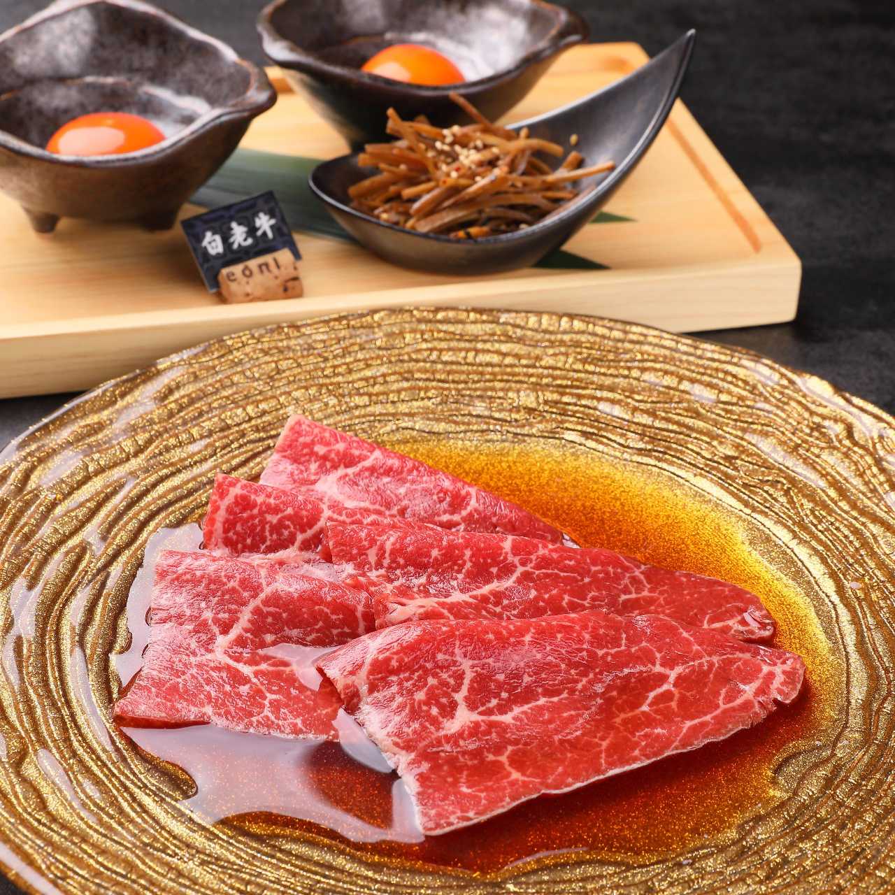 Wagyu beef that has been grilled on a hot griddle or shallow pan is simmered in soy sauce and sugar to make it sweet and salty.