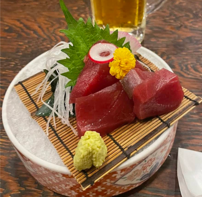 Thinly cut raw bluefin tuna served with soy sauce.
