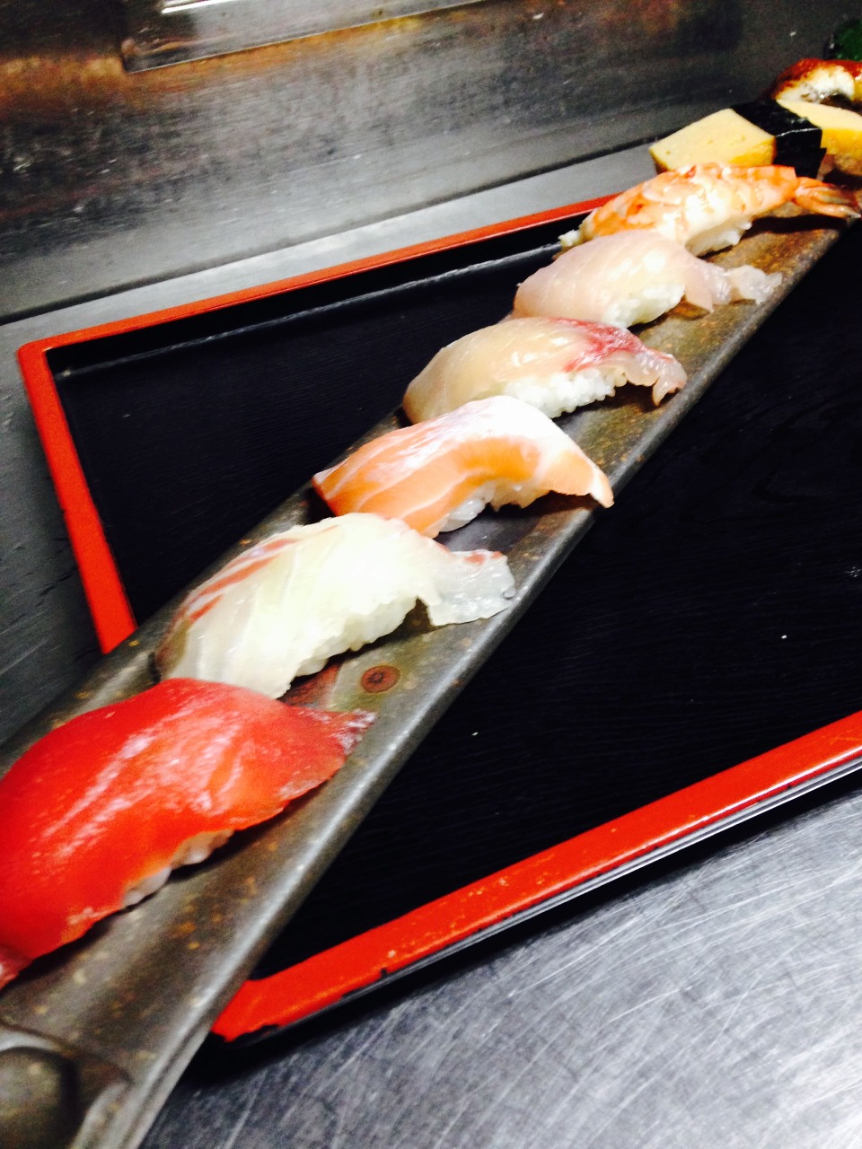 Platter of sushi such as nigiri (hand-rolled sushi) and gunkan (battleship roll sushi).