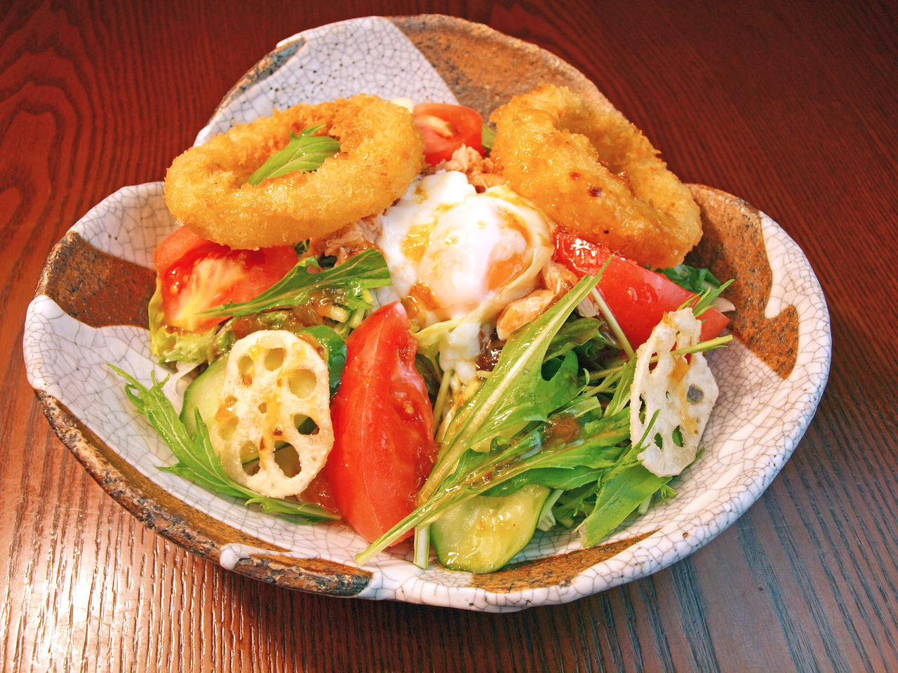 Lettuce, Onion, Lotus root, Tomato, Hen's egg