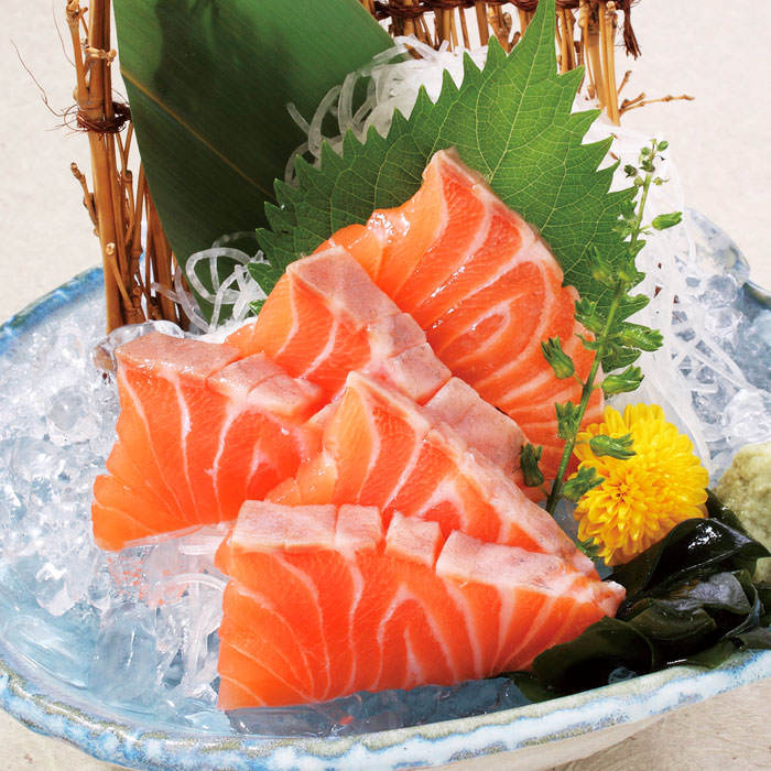 Thinly cut raw salmon served with soy sauce.