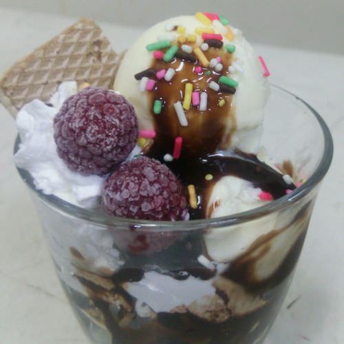 Fresh cream, Ice cream, Corn flakes, Chocolate, Raspberry