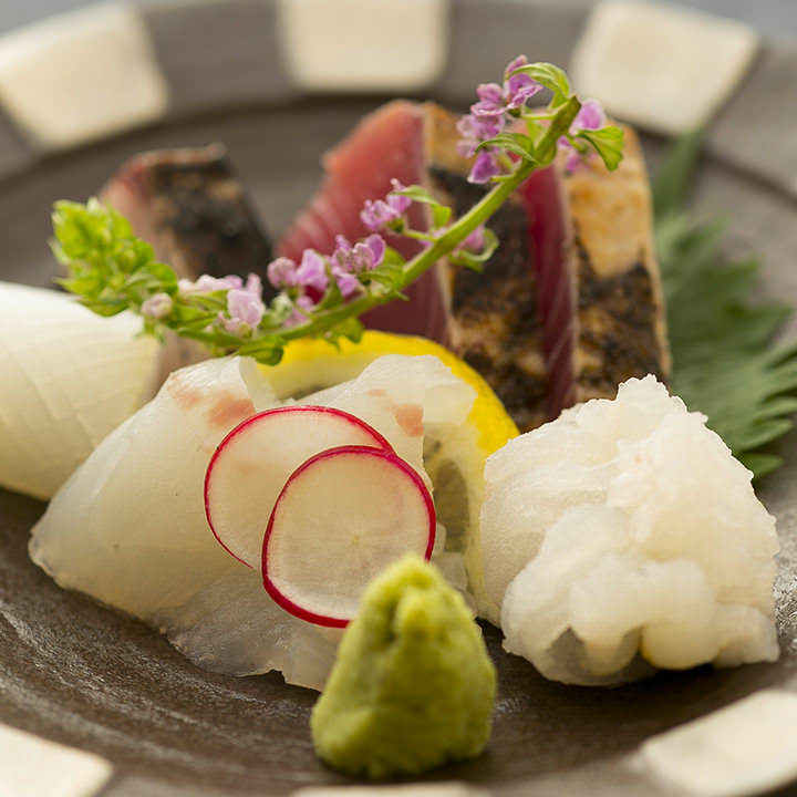 A dish of thinly sliced, raw longtooth grouper, served with soy sauce, etc.