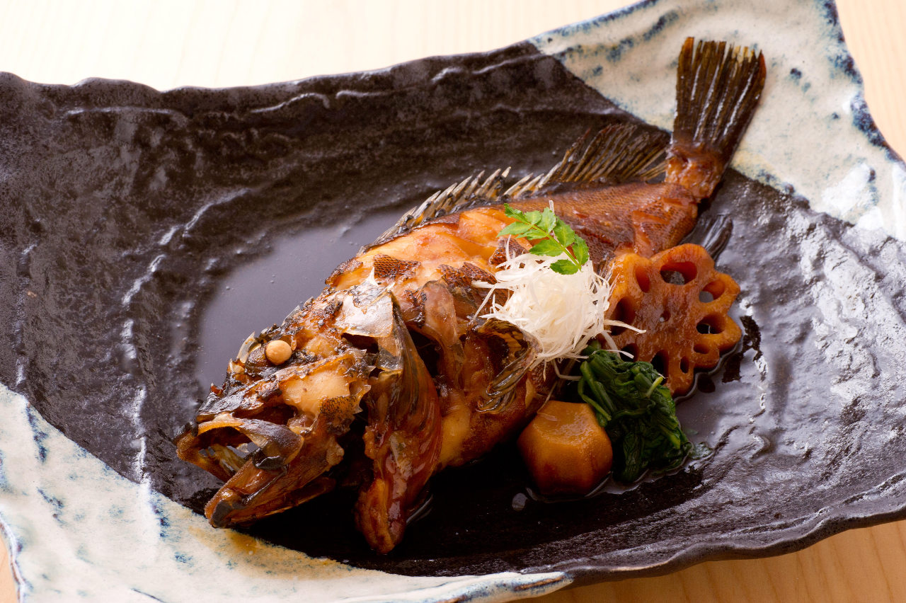 Rosy seabass simmered in soy sauce, mirin, and other seasonings.