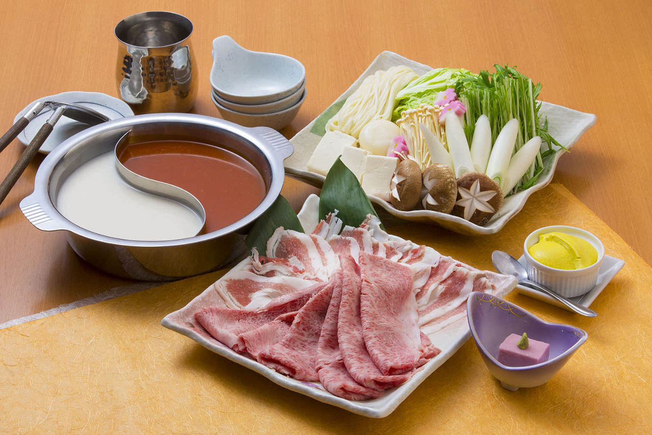 Wagyu beef, Awaji island pork, Chinese cabbage, Potherb mustard (Mizuna), Japanese leek