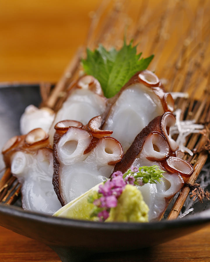 Thinly cut raw or slightly boiled octopus served with soy sauce.