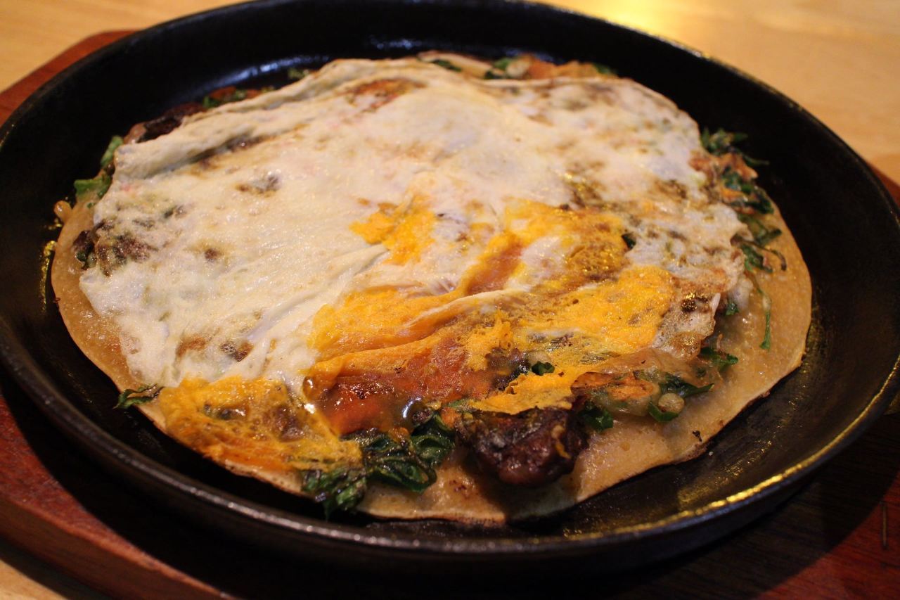 Fermented soy beans and other ingredients added to batter made with flour and grilled on an iron hot plate.