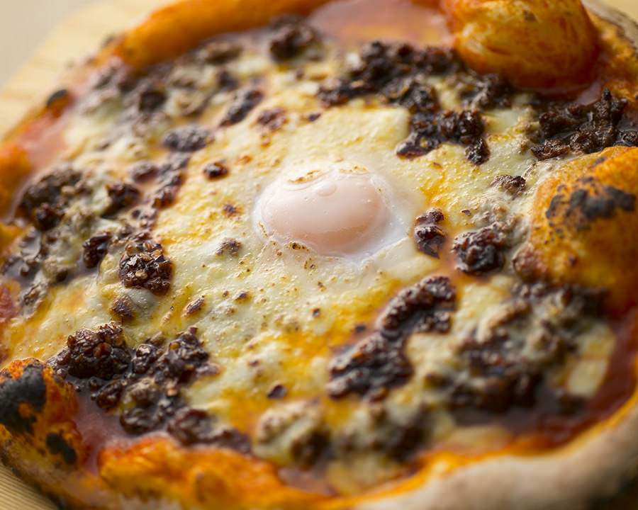 Pizza dough topped with cheese, bacon and soft-boiled egg.