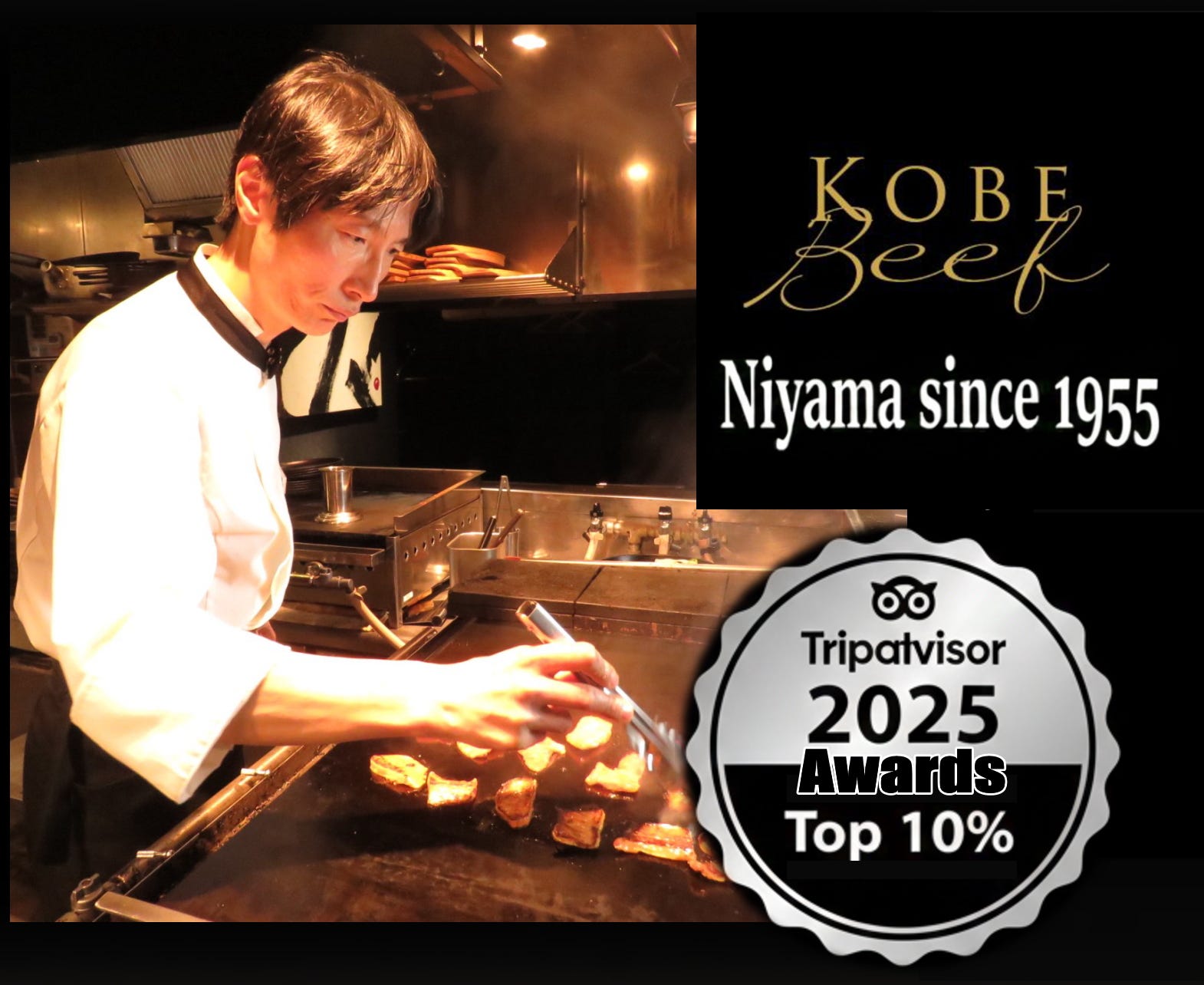 Tripadvisor 2025 "Travelers' Choice" (Top 10% Worldwide) Welcome to Kobe Beef Niyama, an authentic Teppanyaki landmark in Kyoto since 1955. Honored as one of the top 10% of restaurants globally, Experience the artistry of our master chefs as they grill genuine Kobe Beef and premium Wagyu. Perfect for special occasions and gourmet travelers.