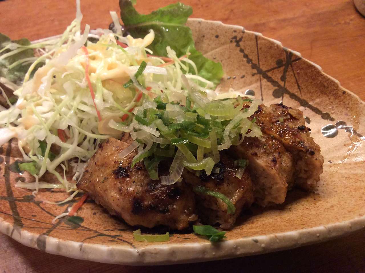 Fresh gluten cooked over an open flame, and brushed with a miso based sauce.