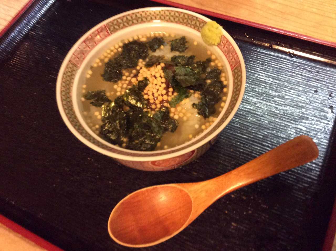 Rice topped with pickled plums with Japanese tea poured over.