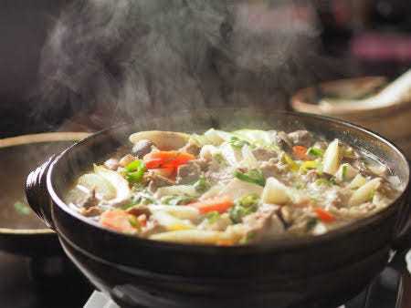 A dish prepared by stewing food ingredients such as udon noodles, vegetables, etc., with dashi soup broth while eating.