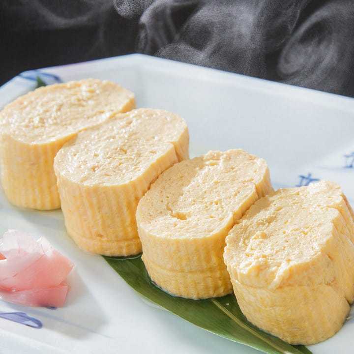 A dish of beaten egg mixed with 'dashi' stock and cooked while simultaneously wrapping.