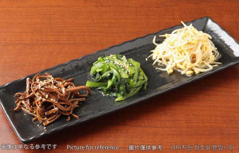 Platter of vegetables, such as bean sprouts, boiled and seasoned with sesame oil and salt.