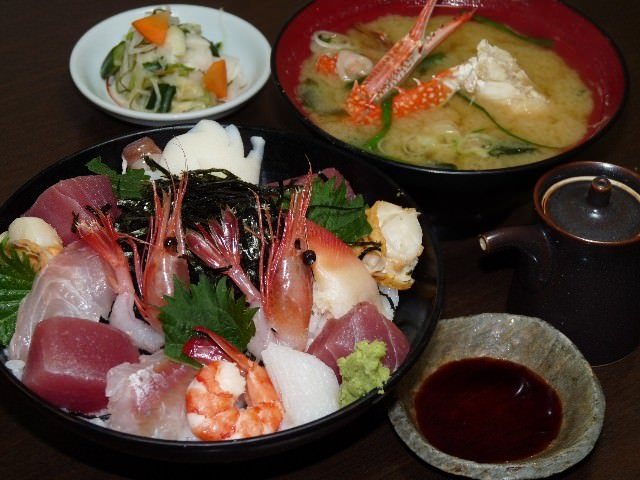 Assorted sashimi served over rice.