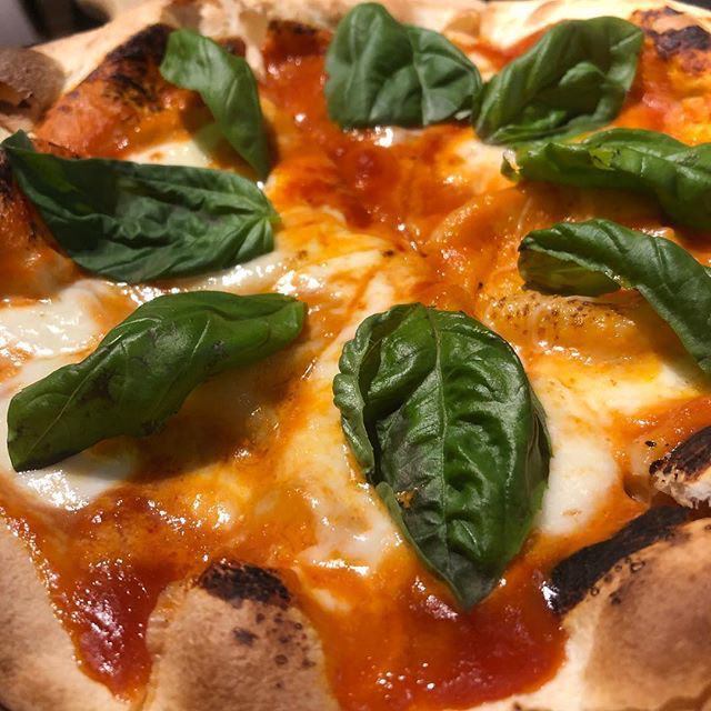 Pizza dough topped with tomato sauce, cheese and basil, then baked.
