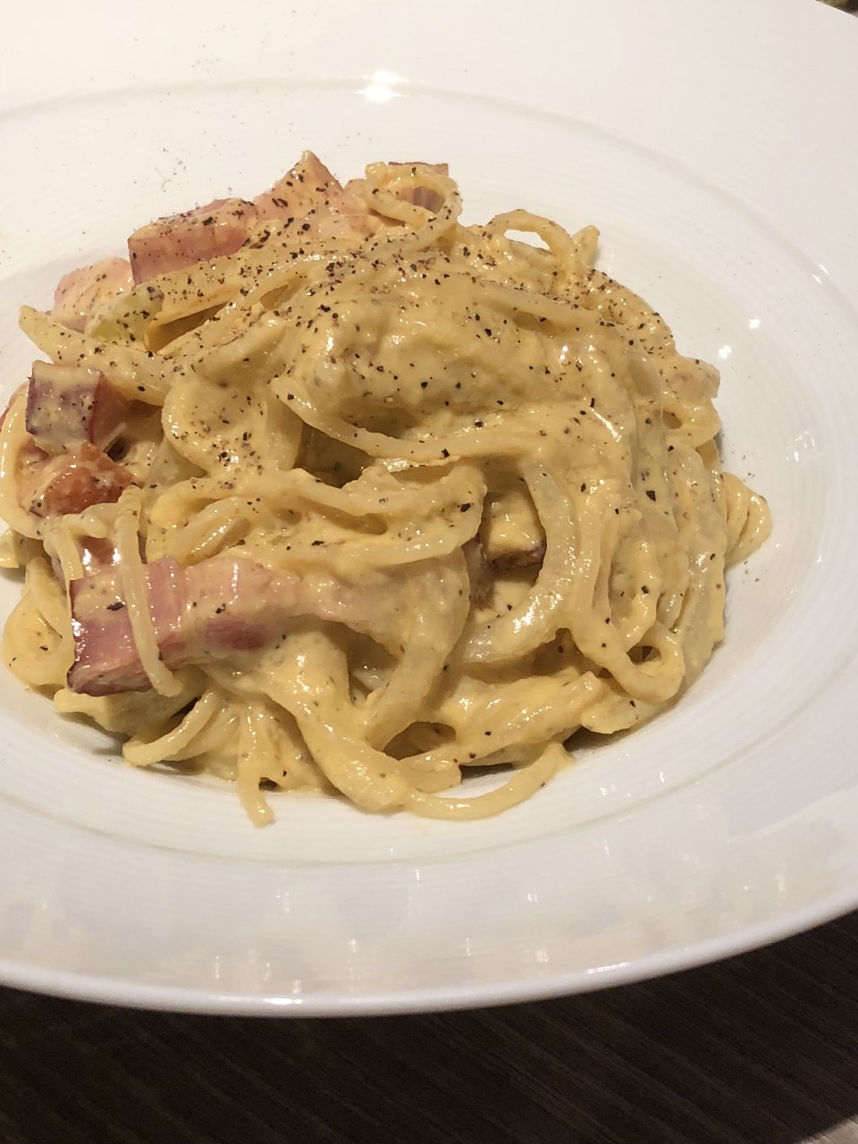 Pasta mixed with sauce prepared from stir-fried bacon, eggs, cheese, and milk.