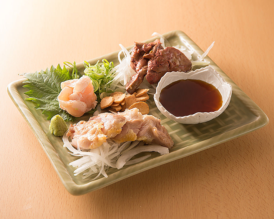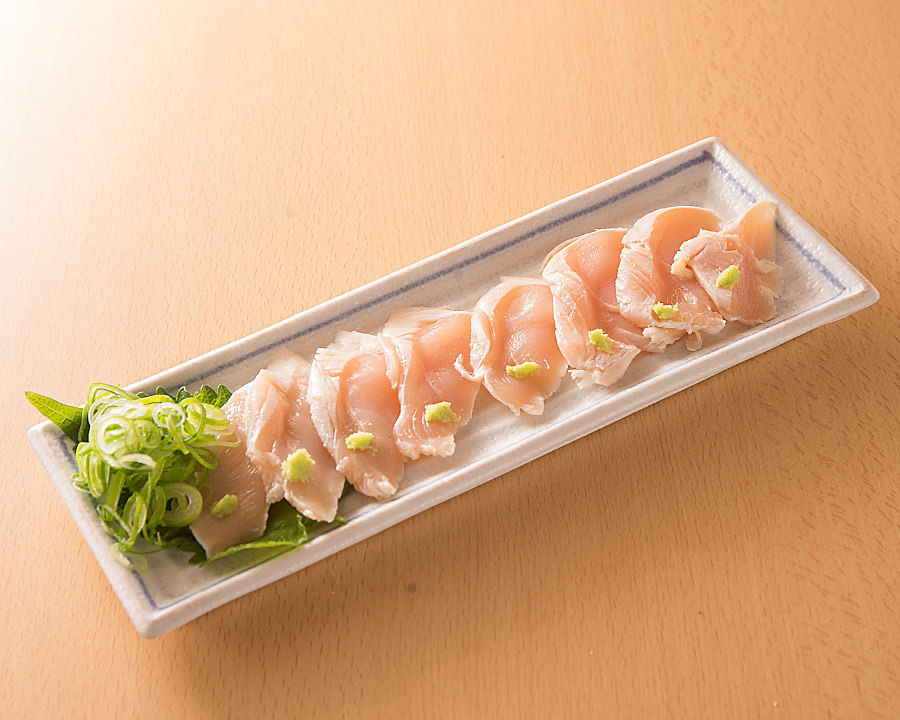 Fresh or lightly boiled, chicken from the boned portion of the front ribcage cut within 1cm, called sasami, covered in sauce and seasoning, served with an egg yolk on top.