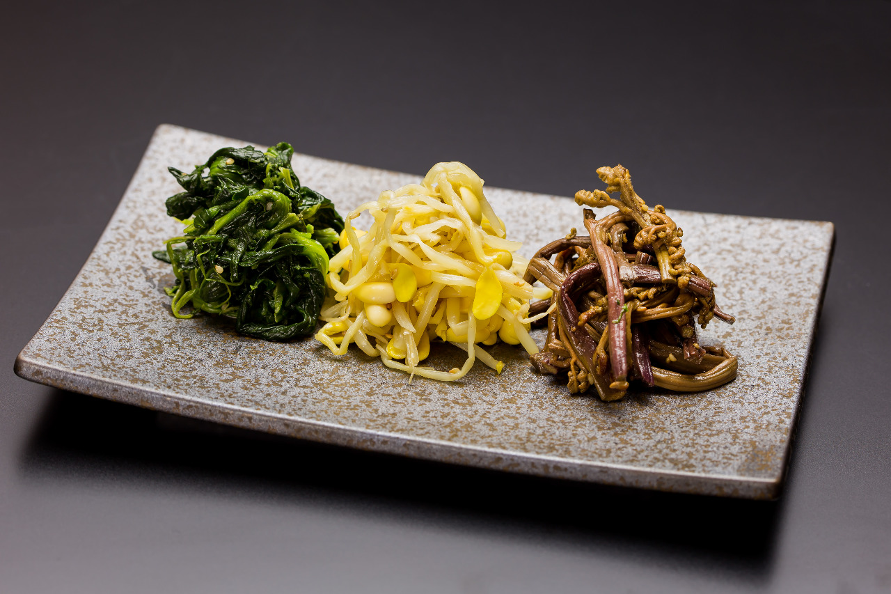 An assortment of 3 kinds of boiled vegetables and wild greens seasoned with sesame oil, salt, and other seasonings.