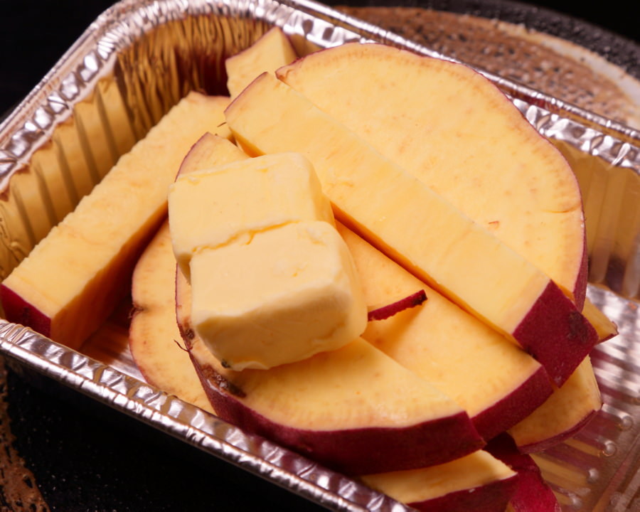 Sliced sweet potato which is deep-fried without breadcrumbs or batter, and seasoned with a sticky butter grilling sauce.