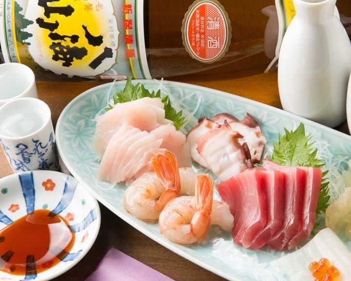 Platter of several kinds of seafood sashimi.