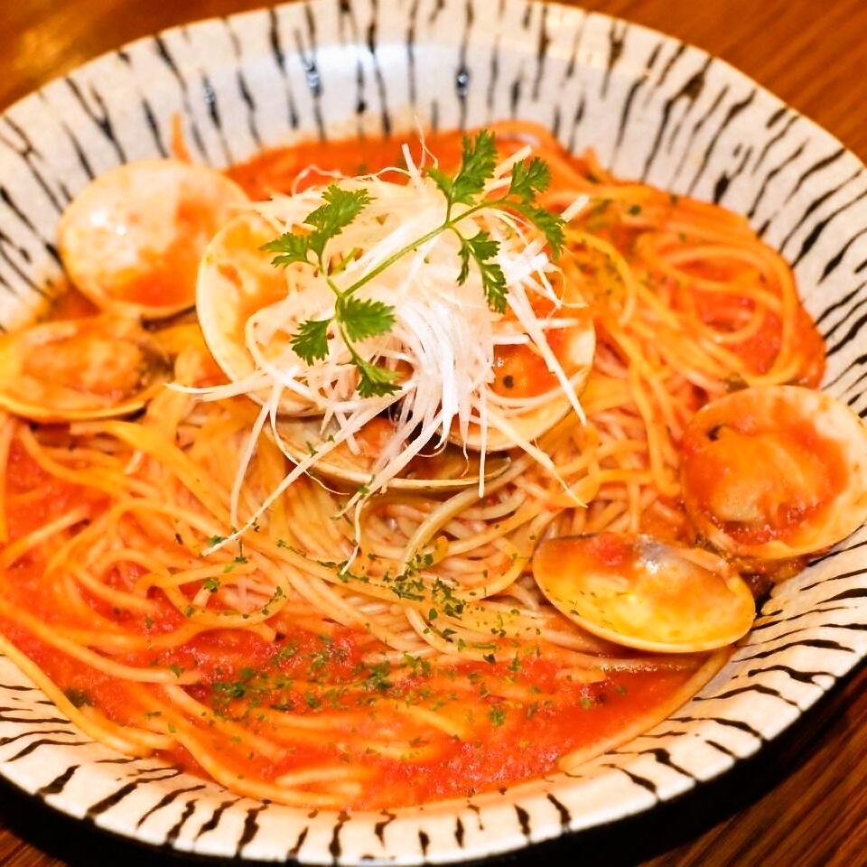 Pasta mixed with seasoned Manila clams and cooked tomato sauce.