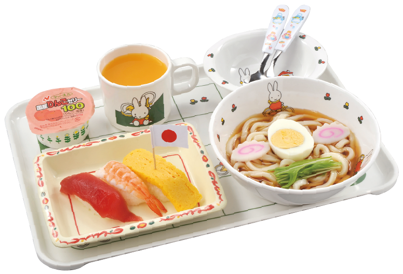 Vinegared rice, Tuna, Shrimp, Hen's egg, Udon, Narutomaki (spiral pattern fish paste), Potherb mustard (Mizuna)