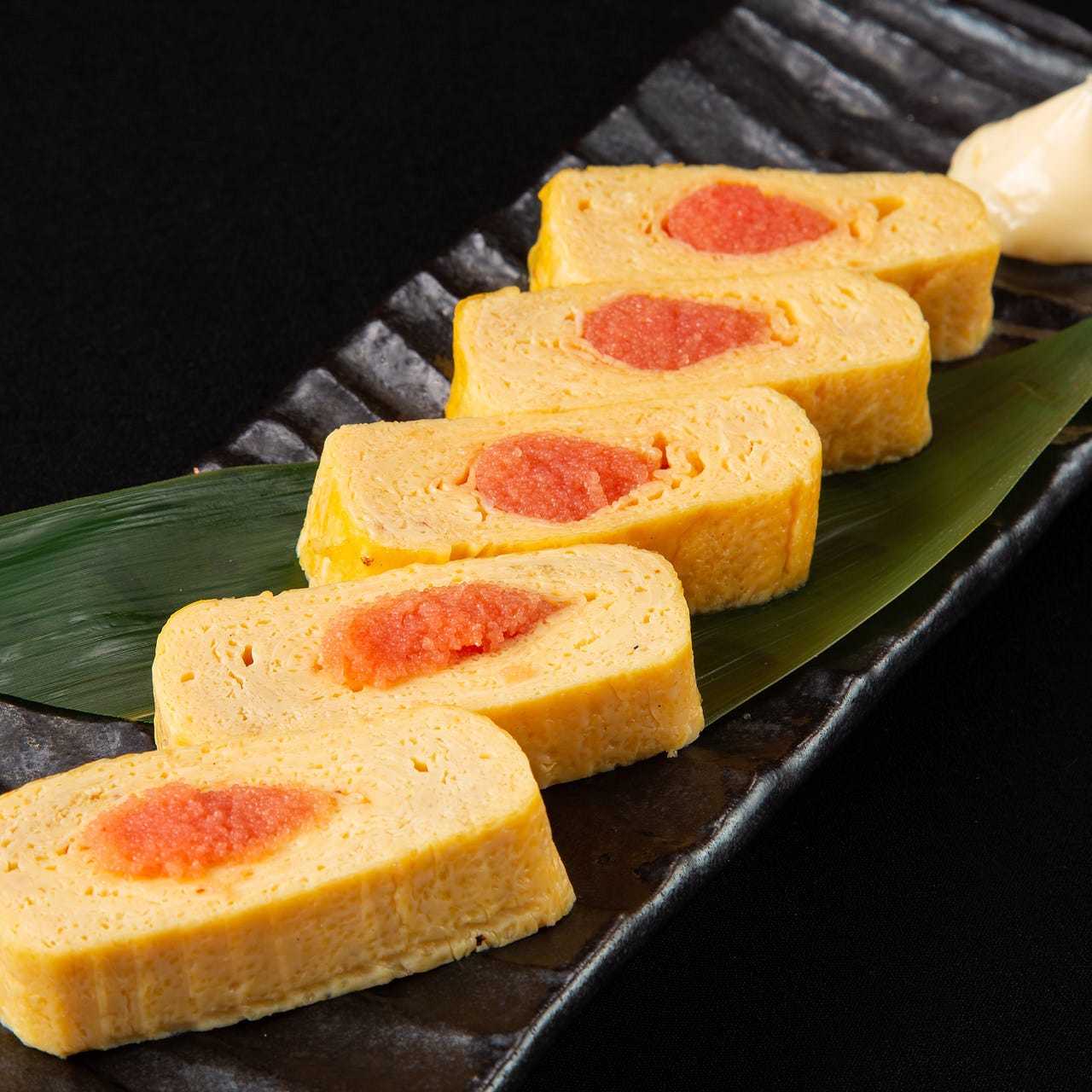 A dish of beaten egg mixed with spicy cod roe and 'dashi' stock and cooked while simultaneously wrapping.