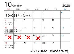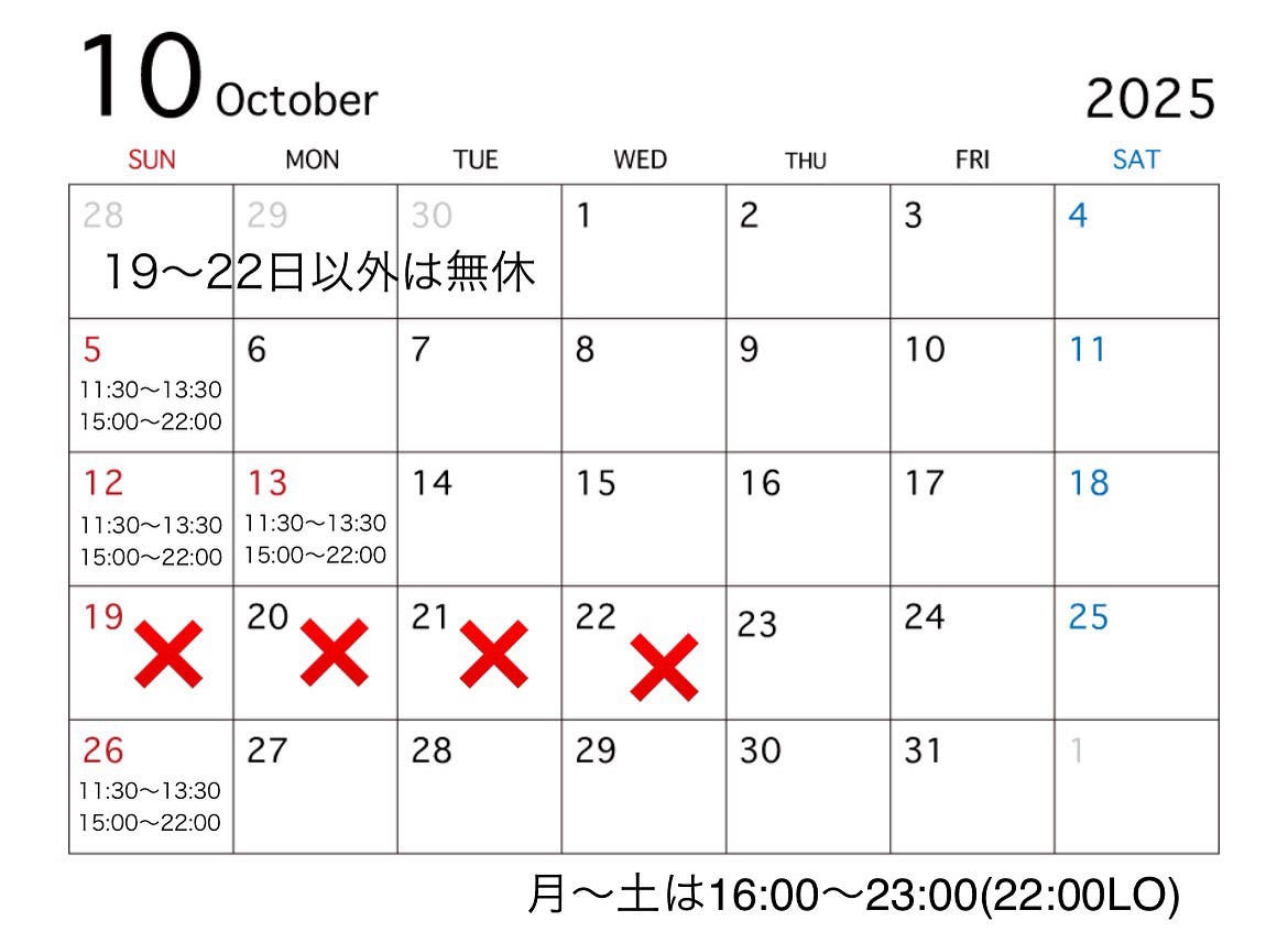 Sunday & Holiday 17:00 - 22:00(L.O.21:00, Drink L.O. 21:30)