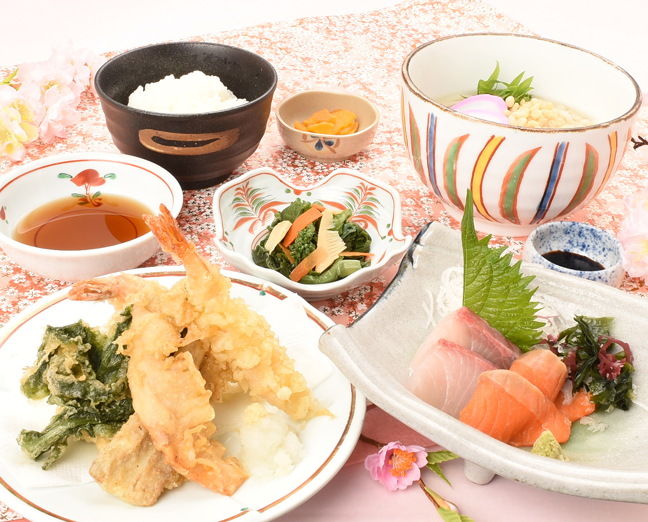Tempura of spring vegetables and sashimi Set with small size udon