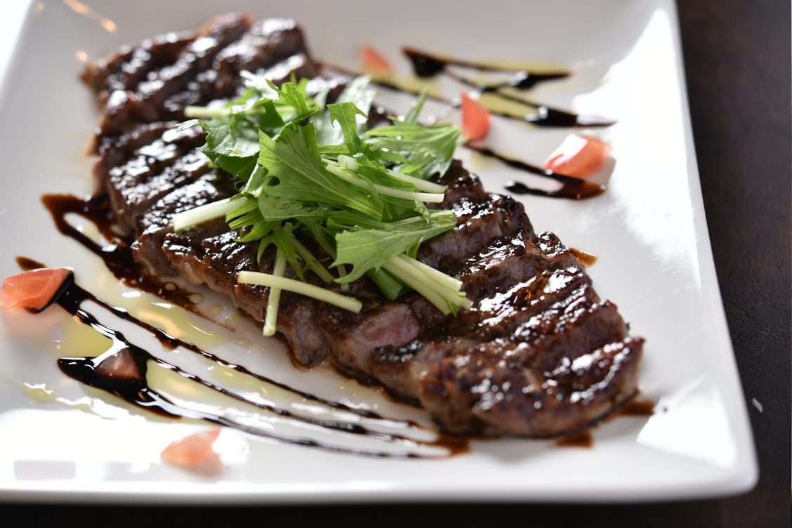 Thickly cut and grilled Japanese beef called "Wagyu" beef.