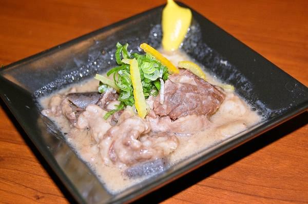 A dish of beef tendon stewed in soy sauce and miso.