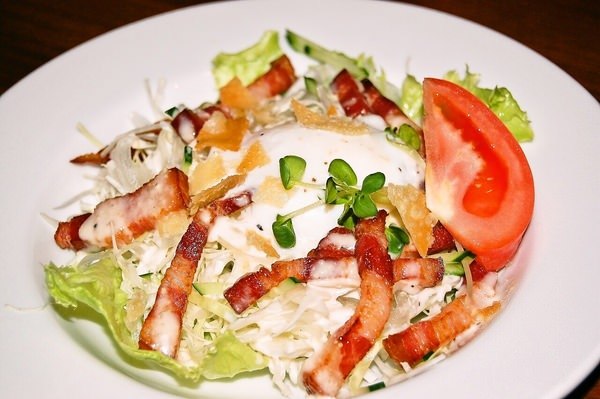 Bacon, Red leaf lettuce, Slow-poached egg, Cabbage, Tomato, Cheese