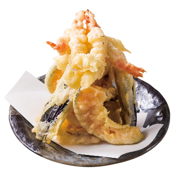 丼に盛ったご飯に、魚介類や野菜の天ぷらをのせた料理。