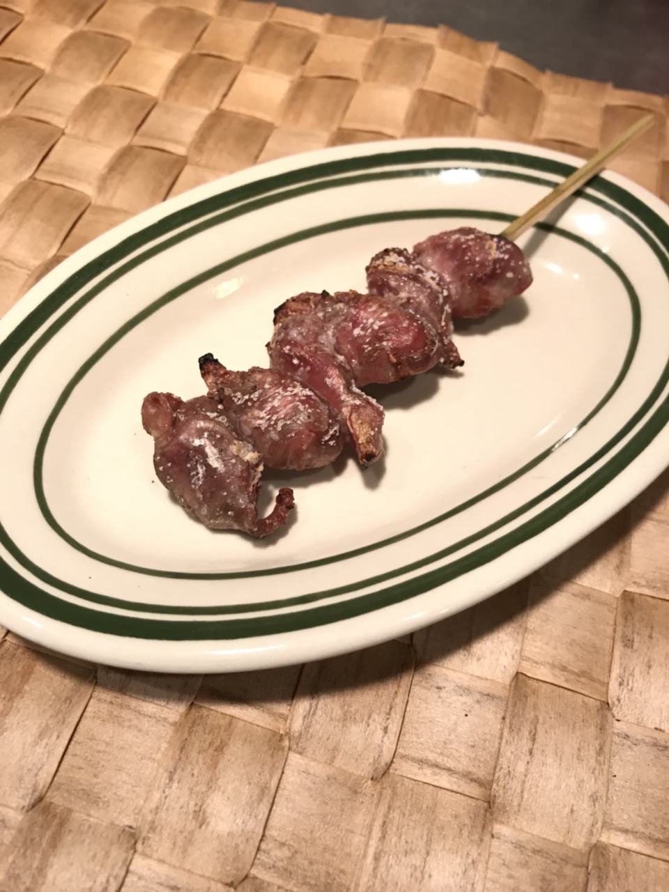 一口サイズの豚バラ肉を串に刺し、直火焼きした料理。