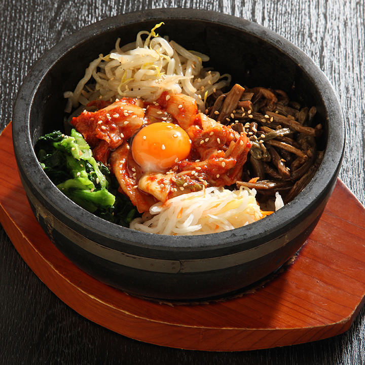 ご飯にナムルと肉、コチュジャン、卵などをのせた韓国料理。
