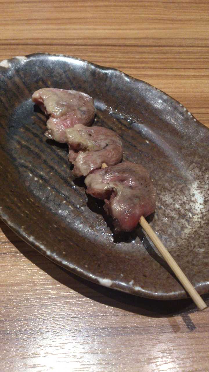 心のこりと呼ばれる、鶏の心臓と肝臓をつないでいる部分を串に刺して直火焼きした料理。