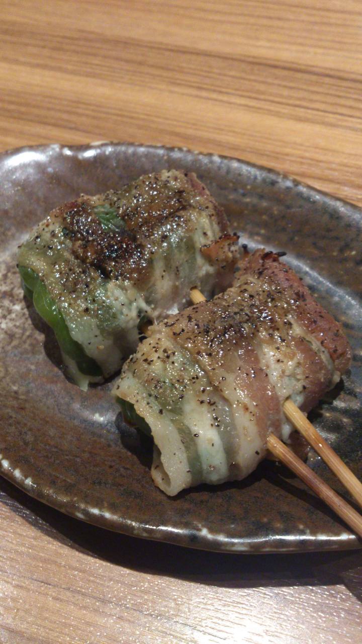 ピーマンとチーズを豚肉で巻き、串に刺して直火焼きした料理。