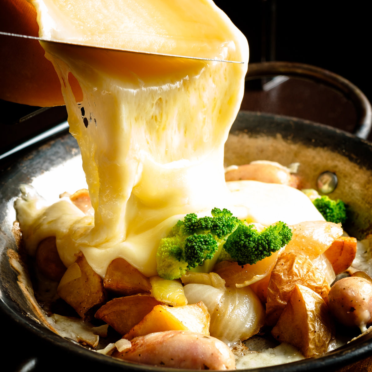 チーズの断面を直火で温め、溶けた所をナイフなどで削いで、具材に絡めて食べる料理。