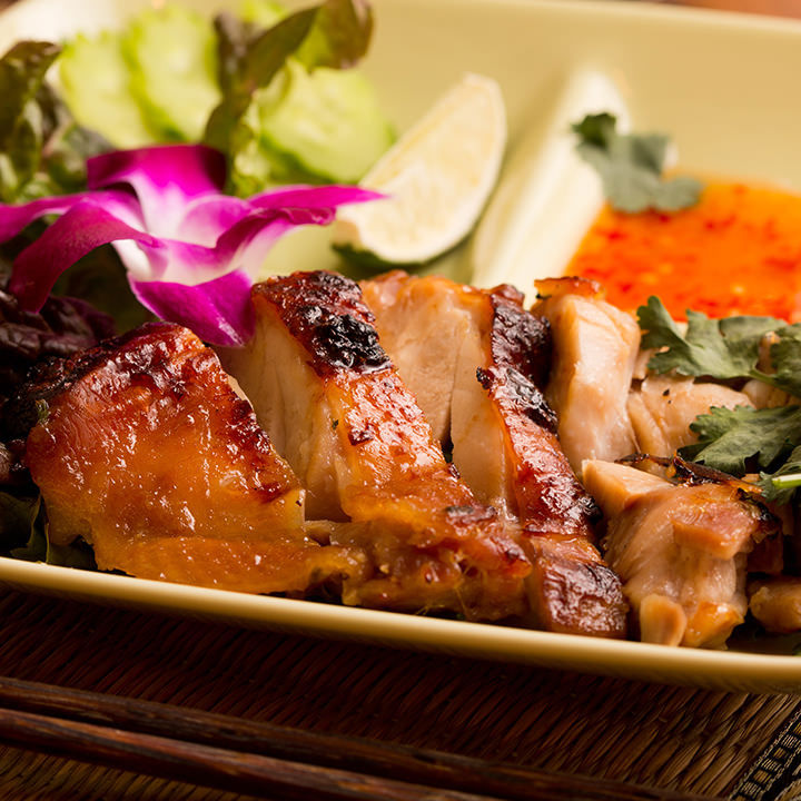 タレに漬け込んで焼いた鶏肉を蒸したもち米や青パパイヤのサラダなどと一緒に盛り付けた料理。