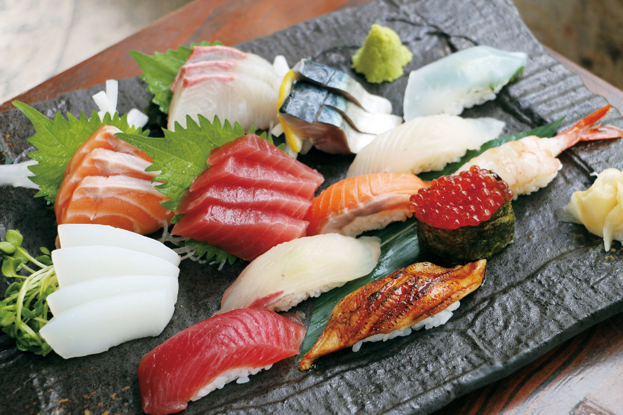 酢を混ぜたご飯を手で握り具材をのせたものと、生の魚介の身を薄く切ったものを盛り合わせた料理。