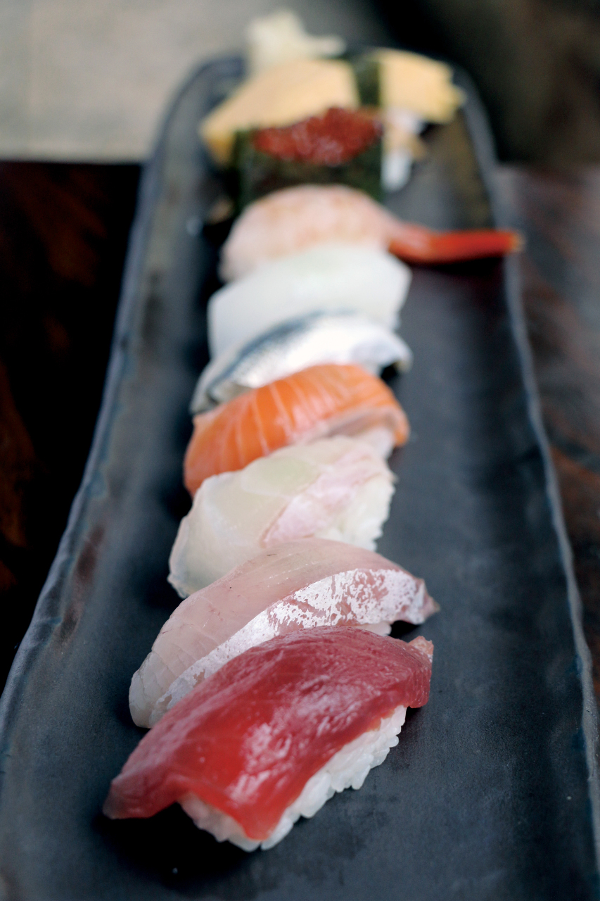 お酢を混ぜたご飯の上に具材をのせて手で握った10種類のお寿司を盛り合わせた料理。