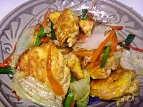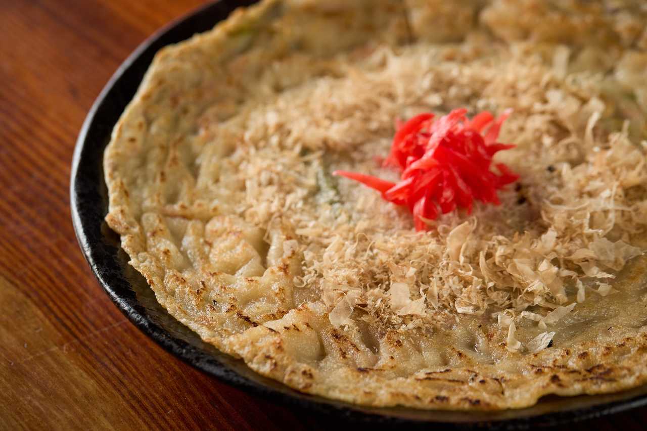 ツナやニラなど入れた溶き小麦粉を平たく焼いた沖縄の家庭料理。