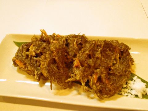 もずく(枝分かれのある糸状の海藻)を小麦粉の衣に付けて、油で揚げた料理。