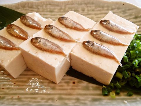 スクガラスと呼ばれるアイゴの稚魚の塩辛を豆腐の上にのせた沖縄料理。