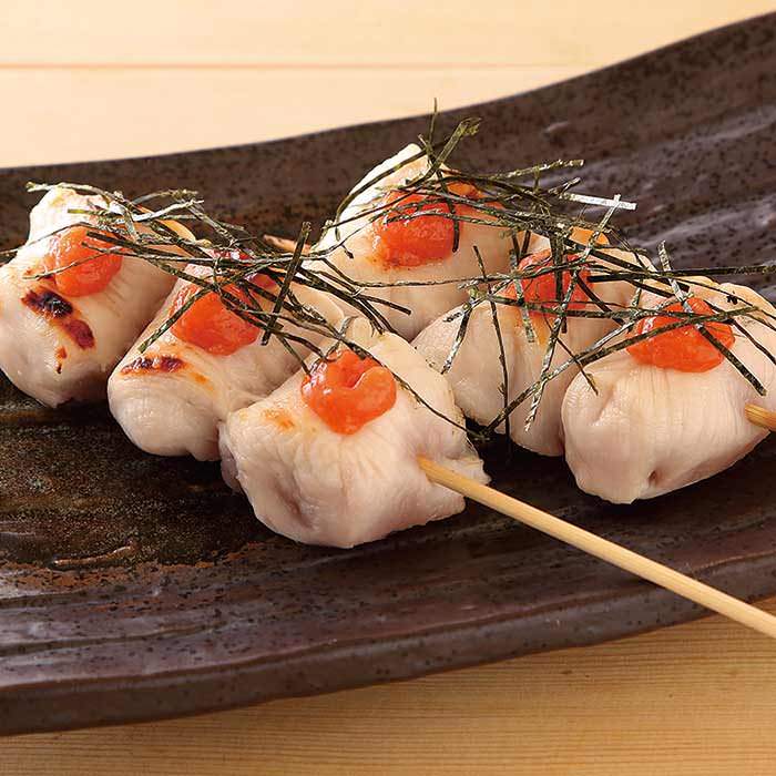 串に刺して直火焼きしたささみに、明太子をのせた料理。