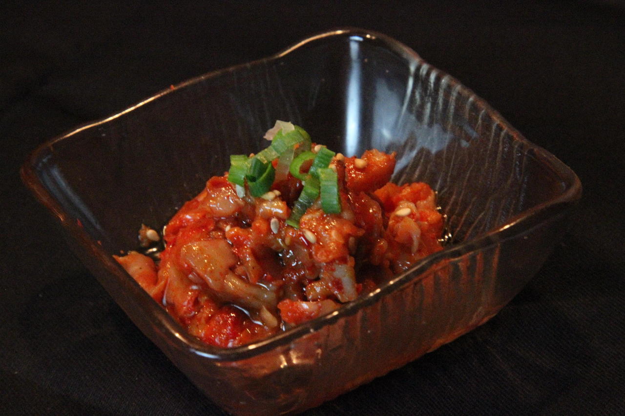 塩漬けにした鱈の内臓を、ごま油と唐辛子などの調味料で味付けした料理。